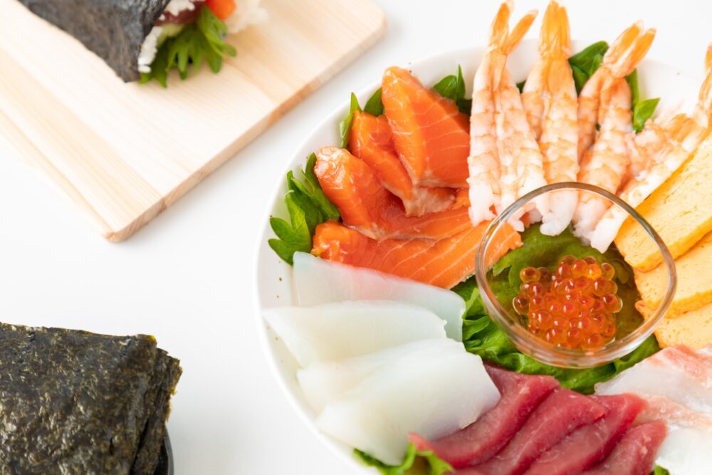 まぐろ・サーモン・海老のうち好みを2〜3品を中心に、卵焼き、きゅうり、しいたけ、大葉などを合わせると風味がまとまります。加熱素材でアレンジするなら、焼き鮭ほぐし、海老天、かに風味かまぼこも扱いやすい選択肢です。