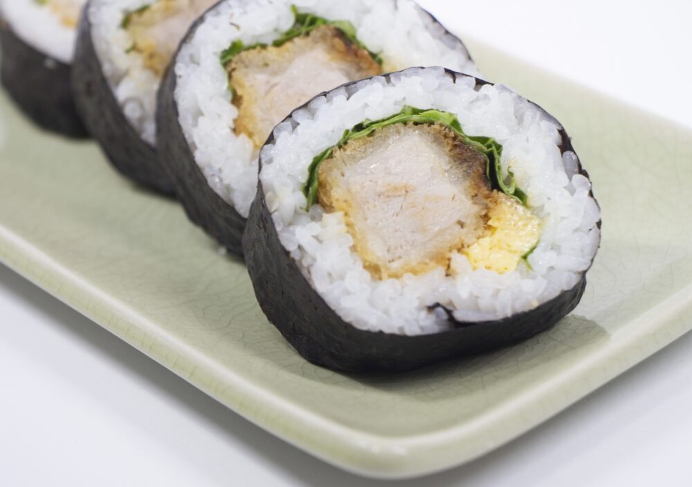 ヒレカツ・えび天・白身フライは主役感が出やすく、きゅうりやたくあん、千切りキャベツを添えると歯切れが整います。ソースは薄く絡め、具は細長く配置すると巻きやすいです。のり1枚に酢飯160〜200gの目安で、厚みを均一にすると形が安定します。