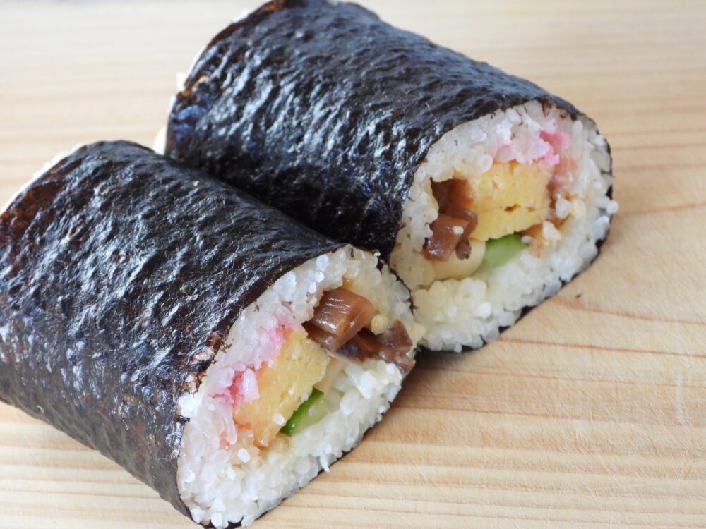 のり1枚分の太巻きは成人で1本が目安、子どもは半分程度に分けると無理がありません。生もの入りは当日中の喫食を前提に、本数と長さを調整します。季節商品の買いすぎは食品ロスにつながるため、食べ切れる量を見積もって計画的に用意します。