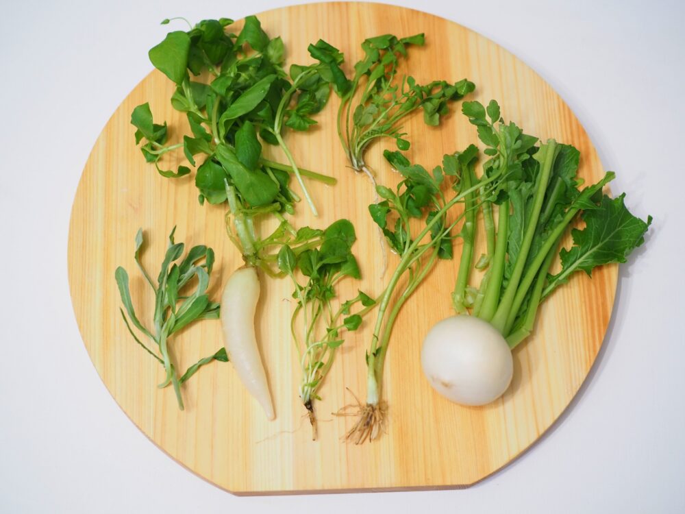 春の七草はせり・なずな・ごぎょう・はこべら・ほとけのざ・すずな・すずしろの七種です。すずな(蕪)とすずしろ(大根)は根と葉を用い、残りは主に葉や茎を刻んで加えます。根菜2種は薄切りにして火通りを均一にし、葉菜は粗みじんで香りを残します。七種という数と、根菜2・葉菜5の構成を押さえると整理が容易です。
