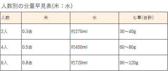 七草粥は米と水を1:5にすると安定して仕上がります。4人の軽い朝食なら米0.5合+水約450mlで茶碗4杯ほどになります。2人は米0.3合+水約270ml、6人は米0.8合+水約720mlが目安です。七草は市販セットなら2人=1/2〜1パック、4人=1パック、6人=1〜2パックが扱いやすいです。所要は20〜30分で、前夜に下ごしらえをしておくと当朝の手間が減ります。