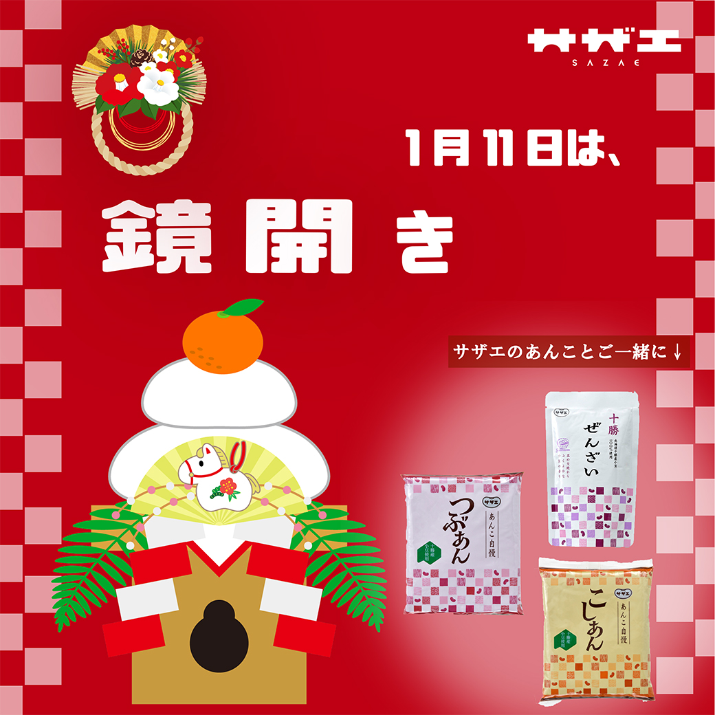 1月11日は、「鏡開き」🎍 2026年1月11日 その他 お正月に飾った鏡餅をいただき、 一年の健康と無病息災を願う日本の大切な風習です。 サザエでは、鏡開きの日にぴったりな つぶあんやこしあん、レトルトのぜんざいをご用意しております。 やさしい甘さのあんこで、ほっと一息つくひと時をどうぞ✨ ※取扱商品の種類や販売期間は店舗によって異なります。店舗でのお買い求めをご検討の際には、お近くの店舗に直接お問い合わせください。
