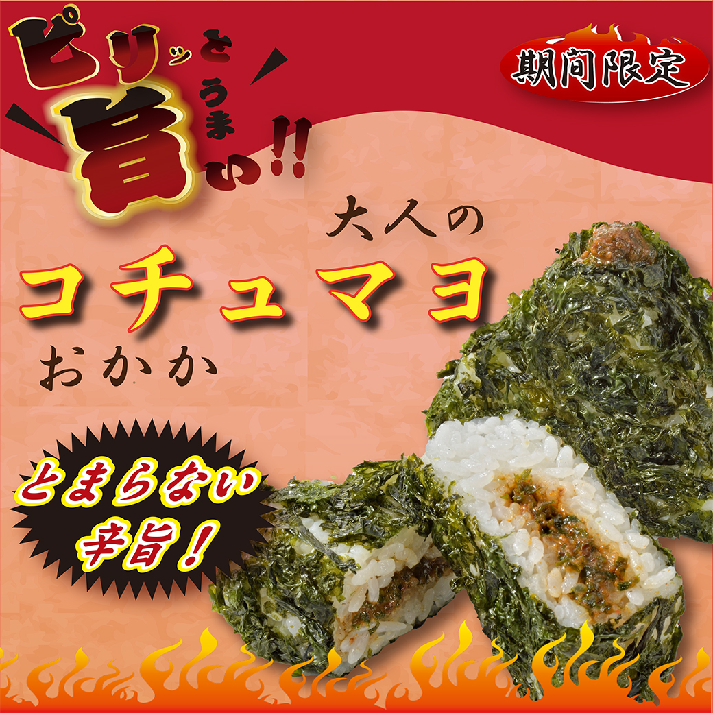 【ピリ旨!大人のコチュマヨおかかおむすび】が登場🍙 2026年1月10日 新商品 【ピリ旨!大人のコチュマヨおかかおむすび】が登場🍙 やみつき注意! コチュジャンソースと豆板醤が味の要🌶️🔥 辛みが強すぎず、辛いものが苦手な方でも食べやすい味わいです。 📌本体価格:280円 (税込 302円) 📅販売期間:1月10日~3月31日 (予定) ※取扱商品の種類や販売期間は店舗によって異なります。店舗でのお買い求めをご検討の際には、お近くの店舗に直接お問い合わせください。
