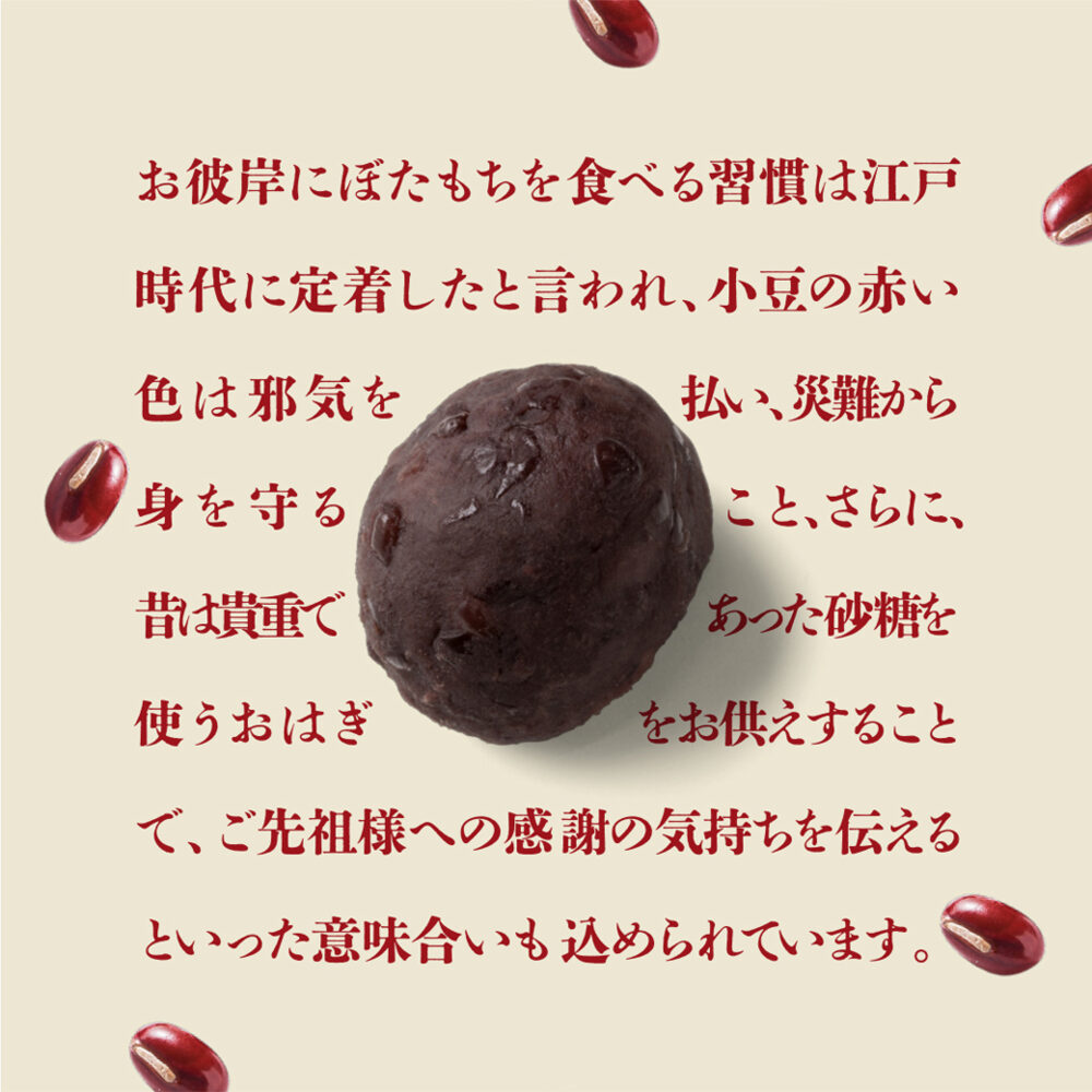 お彼岸にぼたもちを食べる習慣は江戸時代に定着したと言われ、小豆の赤い色は邪気を払い、災難から身を守ること、さらに、昔は貴重であった砂糖を使うおはぎをお供えすることで、ご先祖様への感謝の気持ちを伝えるといった意味合いも込められています。