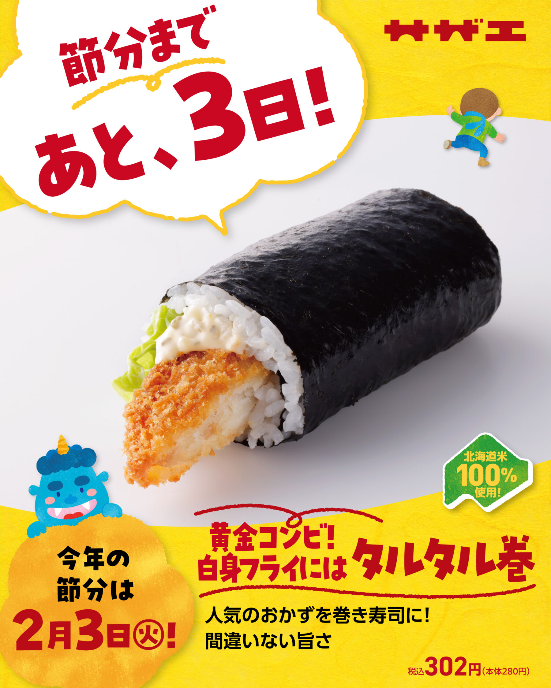 節分まであと3日! 2026年1月31日 新着情報 節分まであと3日! 今回ご紹介するのは、 【黄金コンビ!白身フライにはタルタル巻】 人気のおかずを巻き寿司に!間違いない旨さ 📌本体価格:280円 (税込 302円) 📅販売期間:2月1日~3月31日 (予定) 節分はもちろん、普段のお食事にも、 子どもから大人まで楽しめる、定番のおいしさです✨ ※取扱商品の種類や販売期間は店舗によって異なります。店舗でのお買い求めをご検討の際には、お近くの店舗に直接お問い合わせください。