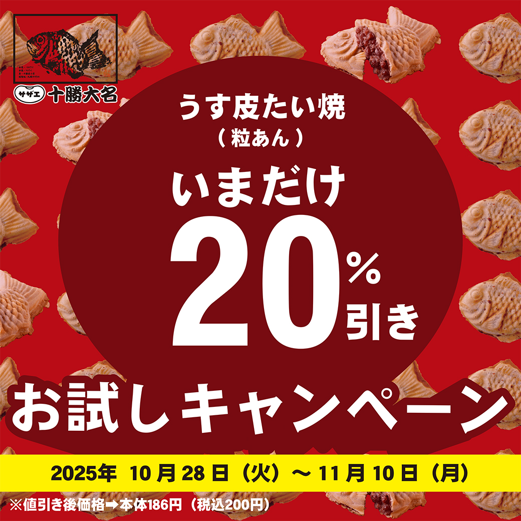 【ココノススキノ限定】うす皮たい焼(粒あん)お試しキャンペーン! 2025年10月28日 新着情報 📣サザエ十勝大名 ココノススキノ店限定! うす皮たい焼(粒あん) お試しキャンペーン! 今だけお得! 自慢のたい焼をぜひお試しください✨ \なんと20%引き!/ 通常 250円(税込) → 割引後 200円(税込) 📅セール期間:10月28日~11月10日 (予定) 📍取扱店舗:サザエ十勝大名 ココノススキノ店