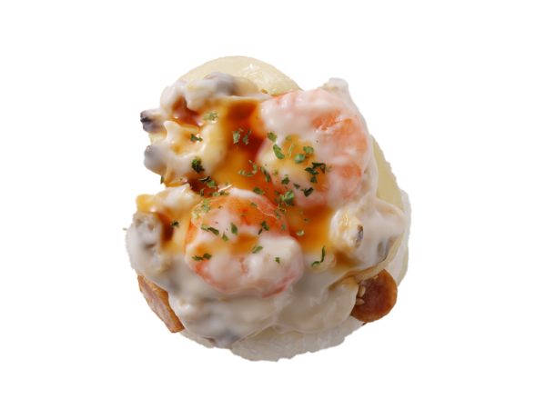 紅鮭ハラスの旨みと香ばしさに、味噌とホワイトソースのコク。 玉ねぎの甘みがアクセントの贅沢焼おむすび