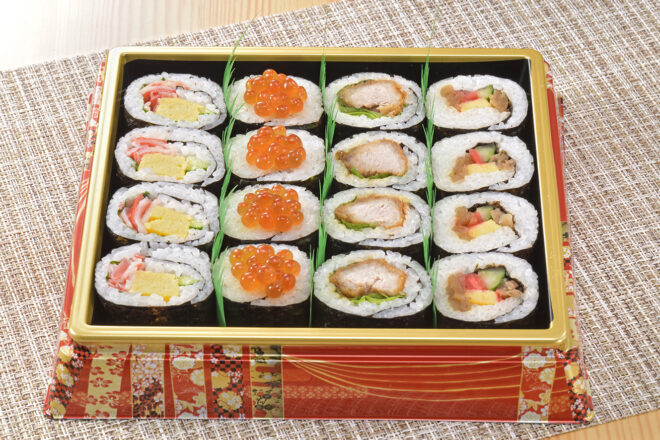 カニ風味サラダ巻、いくら巻、ヒレカツ巻、ミニ太巻