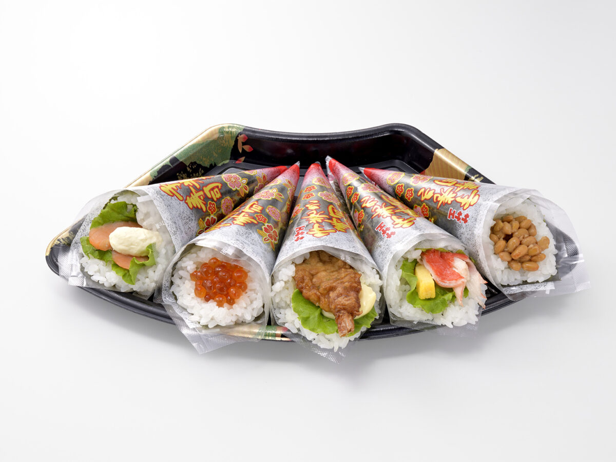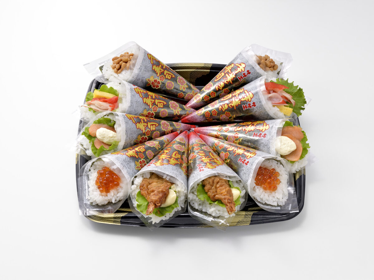 - えび天辛子マヨ手巻寿司(酢飯(うるち米(北海道産)、調味酢、食用油脂)、えび、天ぷら粉、食用油脂、天むすたれ、辛子マヨネーズ、レタス、海苔、青粉)、サーモンクリームチーズ手巻寿司(酢飯、スモークサーモン、クリームチーズ、レタス、海苔)、かに風味サラダ手巻寿司(酢飯、かに風味蒲鉾、玉子焼、辛子マヨネーズ、レタス、海苔)、納豆手巻寿司(酢飯、味付納豆、海苔)、いくら手巻寿司(酢飯、味付いくら、海苔)、添付醤油/加工澱粉、ソルビット、調味料(アミノ酸等)、酒精、pH調整剤、着色料(カラメル、紅麹)、グリシン、膨張剤、安定剤(ローカスト)、乳化剤、増粘剤(加工澱粉、増粘多糖類)、酸味料、香料、グリセリンエステル、明礬、トレハロース、酸化防止剤(V.C)、酢酸(Na)、シリコーン、香辛料、(一部に小麦・卵・乳成分・えび・かに・大豆・さけ・いくら・りんごを含む)