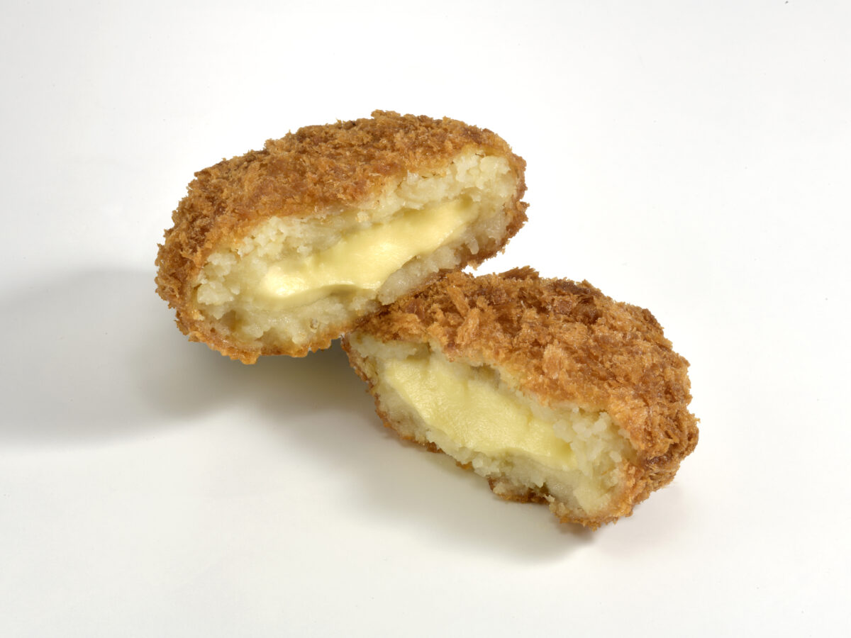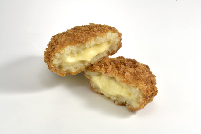 チーズコロッケ(国内製造)、食用油脂/安定剤(加工澱粉、ローカスト)、乳化剤、増粘多糖類、シリコーン、(一部に小麦・卵・乳成分・大豆を含む)