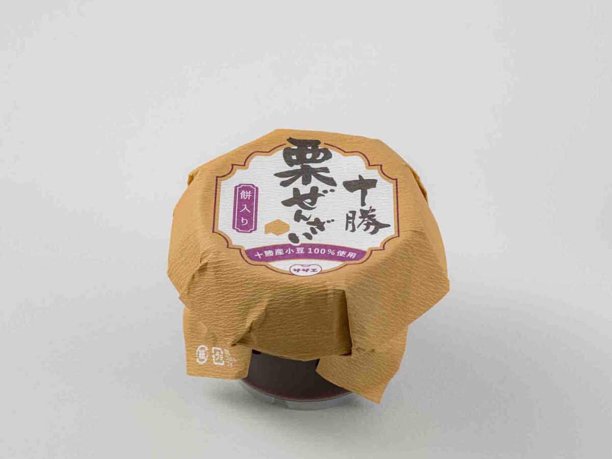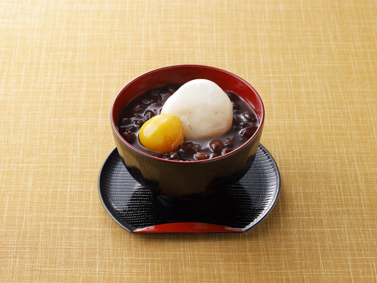 - ぜんざい(砂糖(国内製造)、小豆、栗甘露煮、寒天)、丸餅(別添)(水稲もち米(国内産))/クチナシ色素