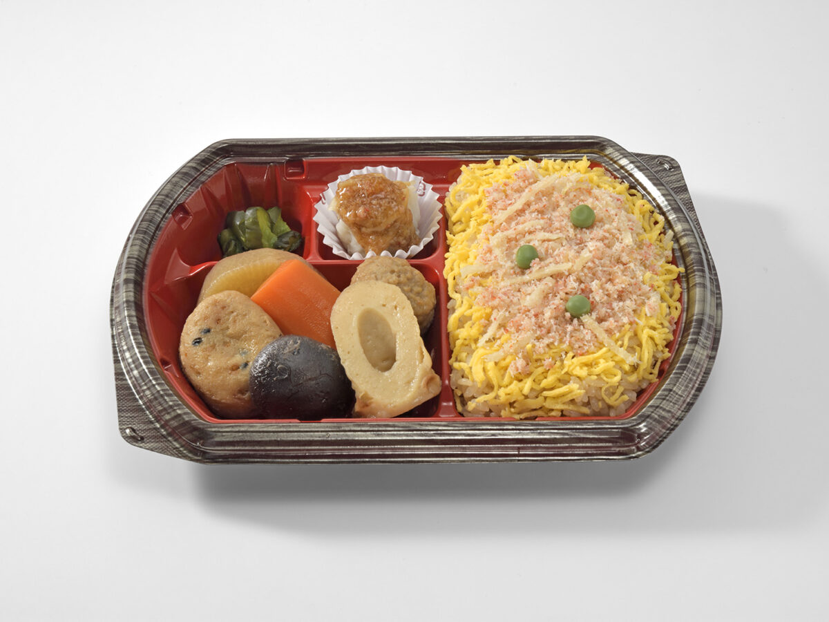 - 味付ご飯(うるち米(北海道産)、調味液、醤油、もち米(北海道産)、調味酢、食用油脂、食塩)、煮しめ(大根、肉団子、人参、竹輪、がんも、椎茸、醤油、味醂、砂糖、穀物酢、和風だし、風味調味料)、蟹フレーク(紅ズワイフレーク、筍、砂糖、和風だし、蟹ソース、針生姜、配合調味料)、肉焼売、錦糸玉子、胡瓜漬物、かにあん(あんかけたれ、紅ズワイフレーク、筍、砂糖、和風だし、蟹ソース、針生姜、配合調味料)、グリンピース/調味料(アミノ酸等)、加工澱粉、酢酸(Na)、pH調整剤、グリシン、酒精、着色料(カラメル、アナトー、黄4、紅麹、ラック、青1)、リン酸塩(Na)、酸味料、乳化剤、塩化Ca、保存料(ソルビン酸K)、リゾチーム、ショ糖エステル、甘味料(ステビア)、酸化防止剤(V.C)、増粘剤(加工澱粉、増粘多糖類)、炭酸Ca、(一部に小麦・卵・乳成分・かに・大豆・ごま・鶏肉・豚肉・りんごを含む)